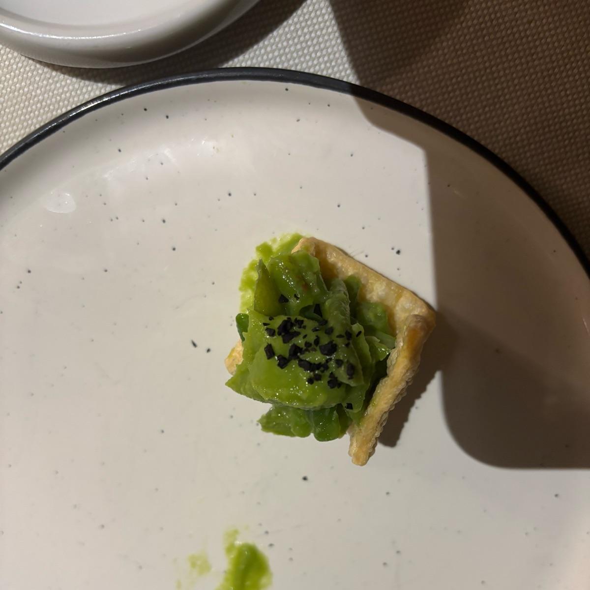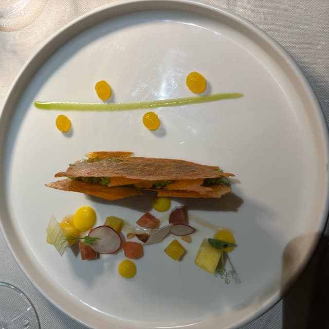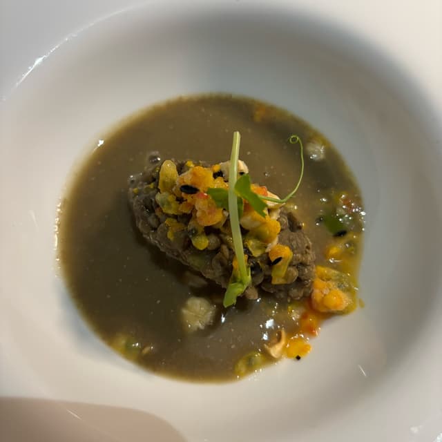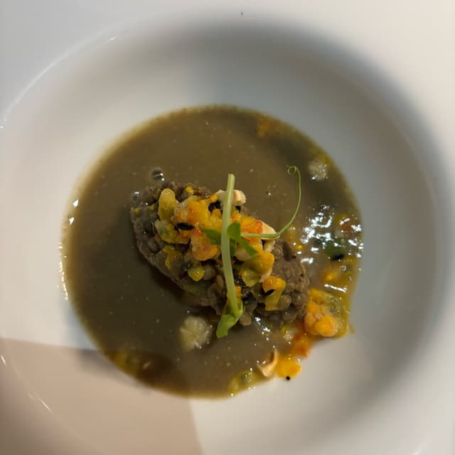 In questa prima tranche l’entree consiste in un insipido maccherone soffiato con sopra dei fagiolini ❌ poi selezione di panificati di loro produzione: due grissini, due panini e due pezzi di focaccia; fogli di riso croccante alla paprika con all’interno taccole. Queste due portate abbastanza buone, niente di entusiasmante ma comunque buone. Quenelle di lenticchie con crema liquida di lenticche alle