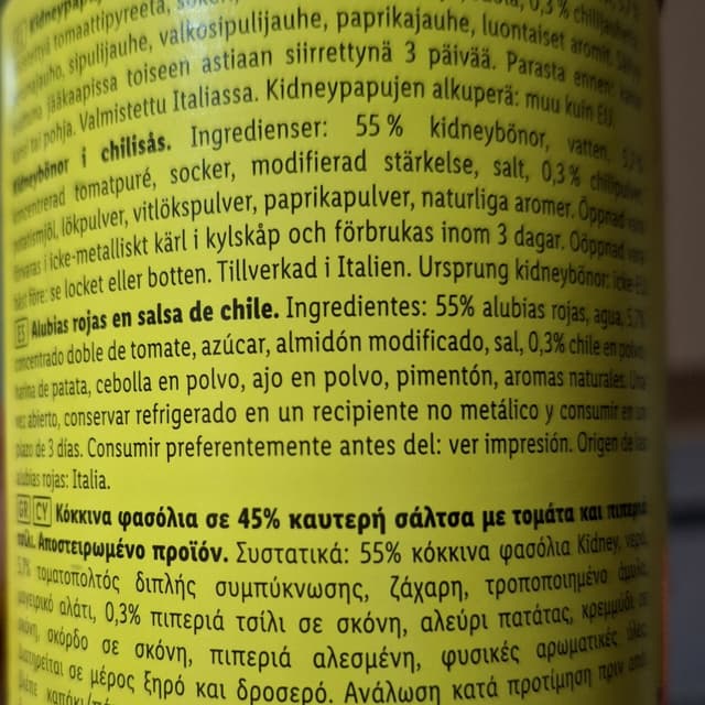 Bote de 420 gramos de frijoles rojos en salsa, a base de pimentón, tomates, ajo y cebolla, un poco picante. Muy rico.