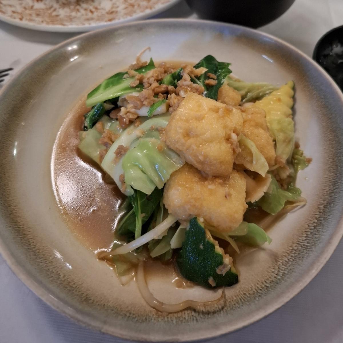 È tofu fritto con verdure e simil-macinato. Non è stato il piatto più memorabile della cena, le verdure erano decisamente troppo al dente e in generale il sapore era un pò piatto, ma d'altronde avranno ingranato la retromarcia con le spezie per esaudire la nostra richiesta.