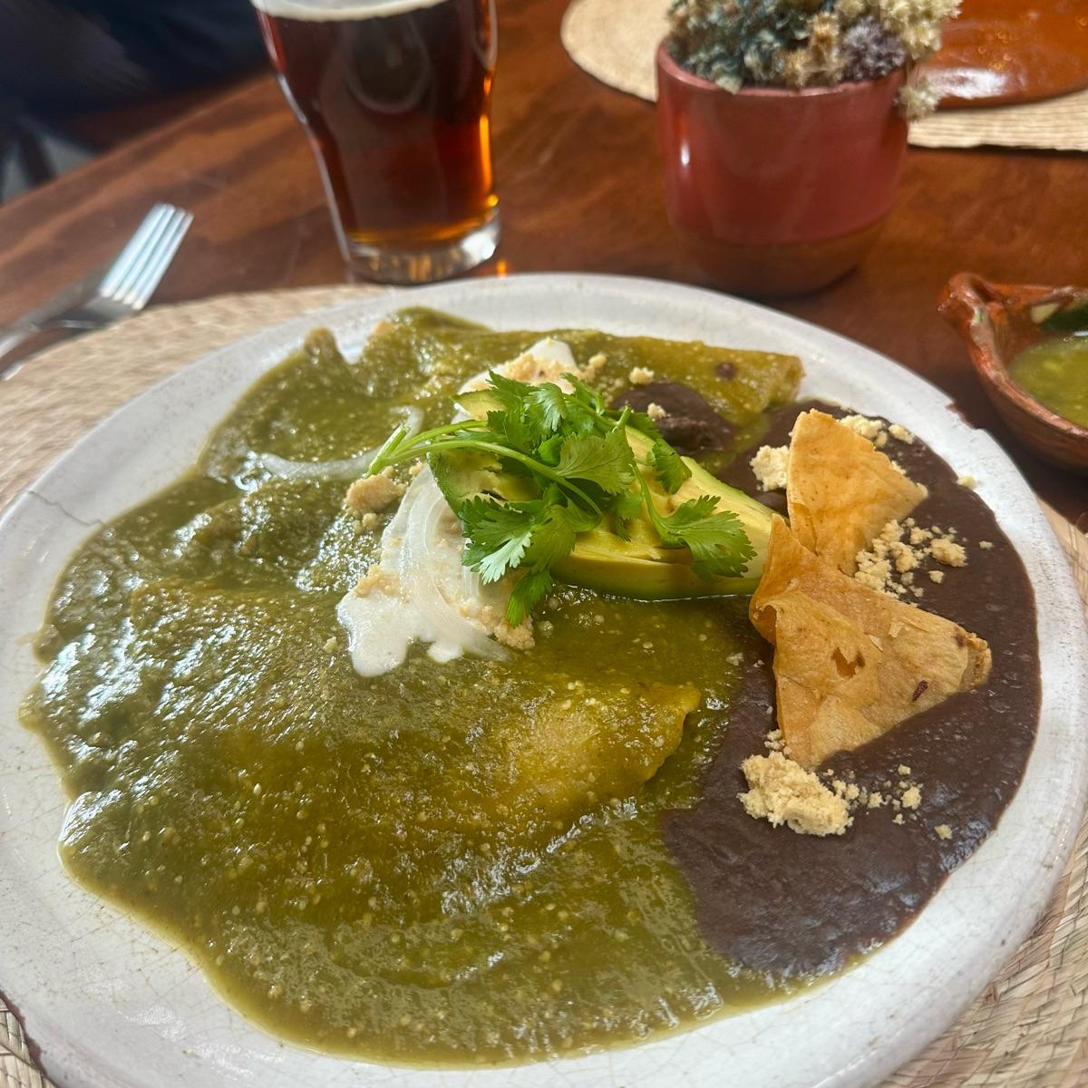 Debajo de toda esa salsa 😅 hay 3 enchiladas rellenas de papa, va frita con cebollita y les queda muy rica 😁 La salsa verde sabe muy bien también pero lo malo es que la dejan muy espesa por lo que cae un poco pesada. También me gustaría que le pusieran más crema y quesito de garbanzo porque le ponen súper poquito 🥹 pero se compensa con el aguacate y los frijoles. Considero que porción es adecuada 👍 #veganenchiladas #govegan #veganmexicanfood #mexicovegano #veganiseasy