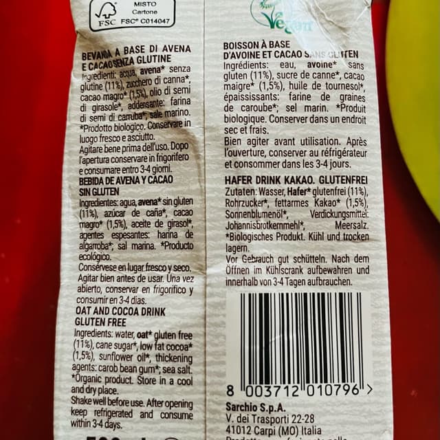 Bevanda di fiocchi d'avena e cacao di Sarchio. Buona per mettere crocchini. Bene anche per allungare caffè o orzo. Per berla da sola forse preferisco bevande di cocco e cacao, più liquide. In questa è come se si sentisse che è un po’ farinosa.