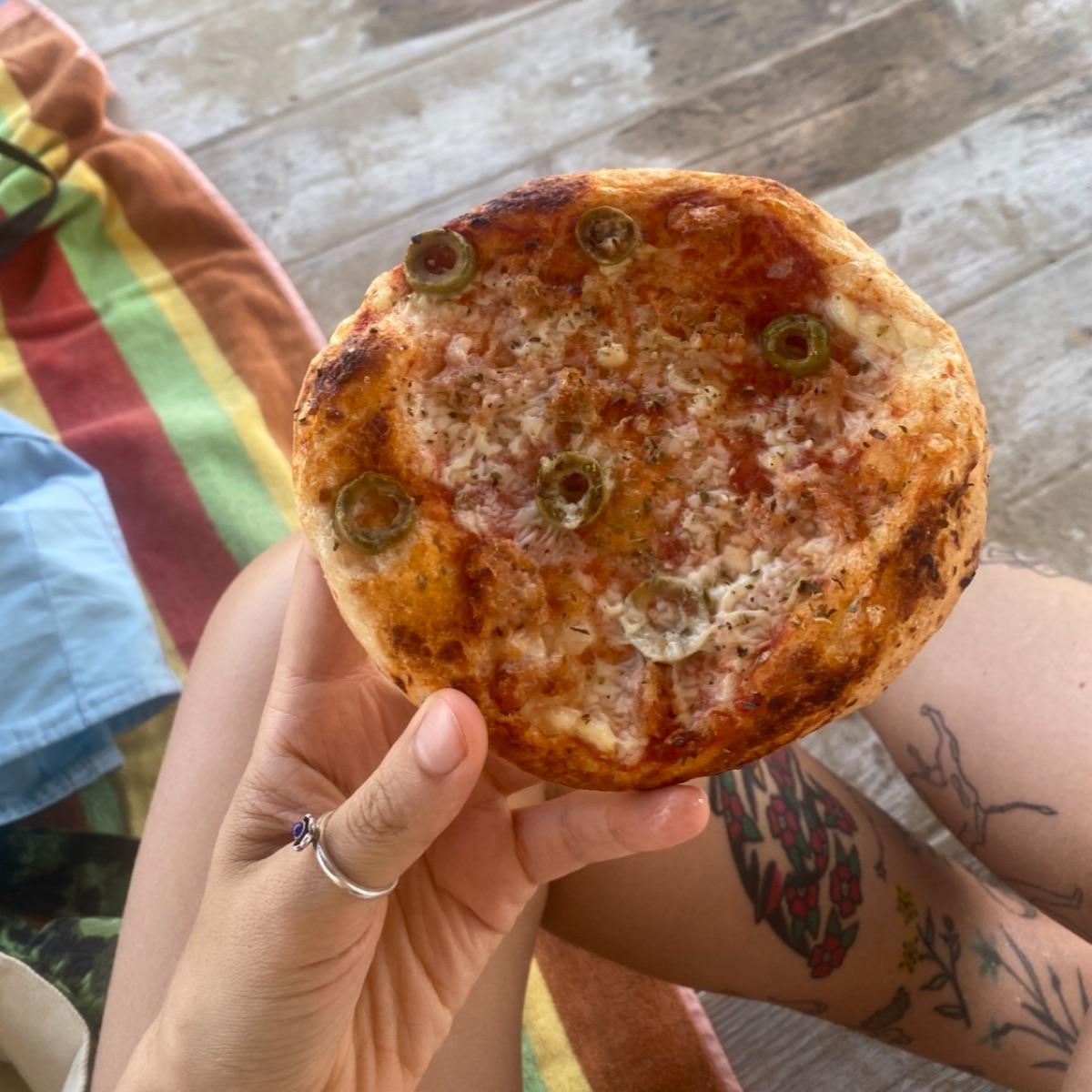 Pizzetta tonda (tipica pescarese) con pomodoro, formaggio vegetale, salsiccia finta e olive. Buona (senza glutine, l’impasto ha la sua consistenza particolare)