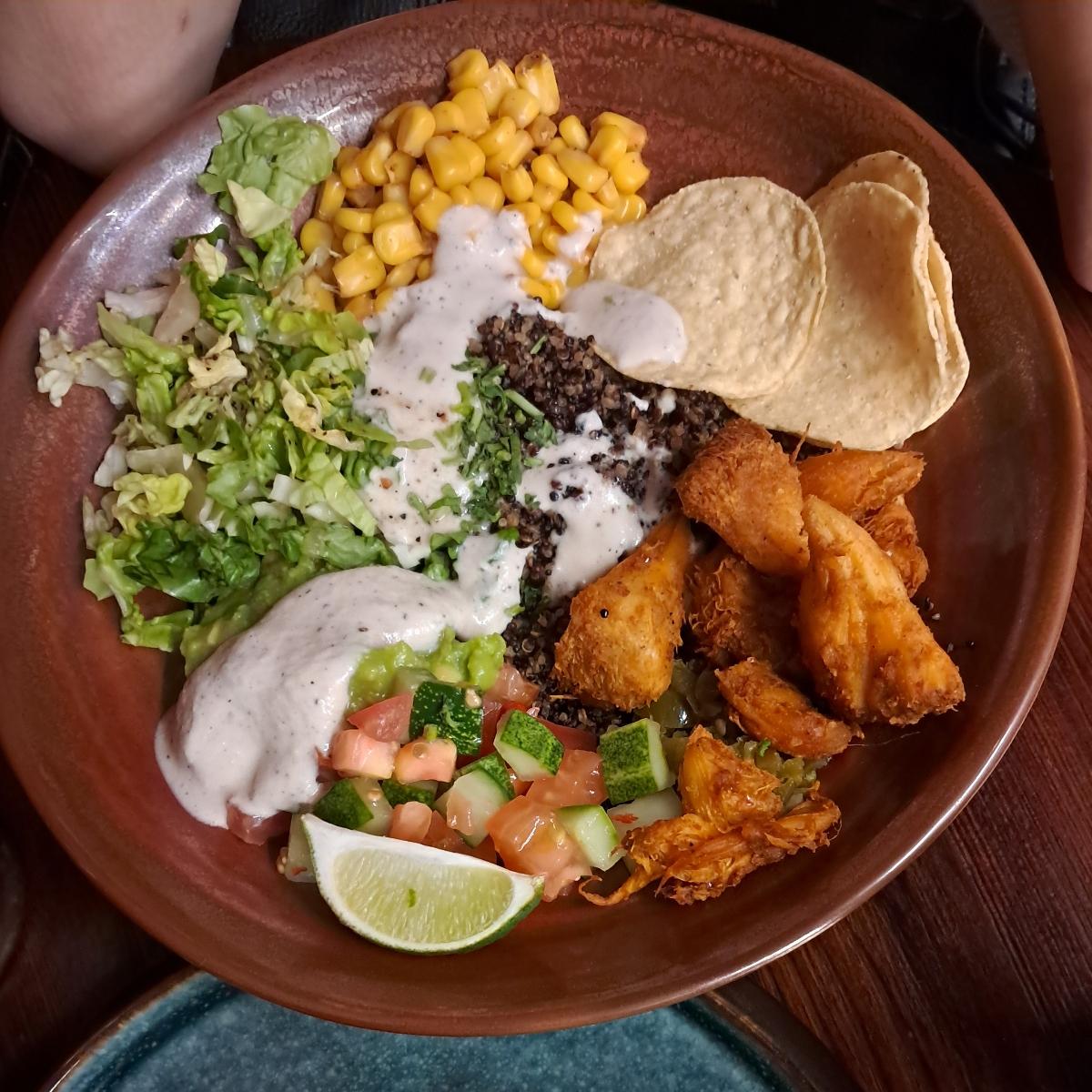 good mix of different flavours blended tgt w the spicy lion mane mushroom, sweet and smokey corn, guacamole, lil bit of tomato salso and jalapeno ; interesting choice of having chips w this 😅 yummy but on the pricey side