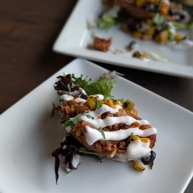#potatolover #potato #chorizo #vegansausage #veganmeat #veganpork #sourcream #blackbeans #corn #tajin #appetizer #starter #texmex