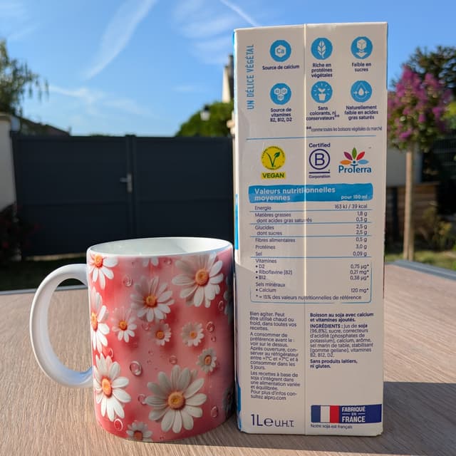 On the positive side, I think it's really great for cooking. It's perfect for my recipes, like in smoothies or as a substitute for cow's milk in cakes and other preparations. Plus, it's certified vegan, rich in plant-based proteins, a source of calcium, and made in France! It's also deforestation-free, which is a huge bonus for me.