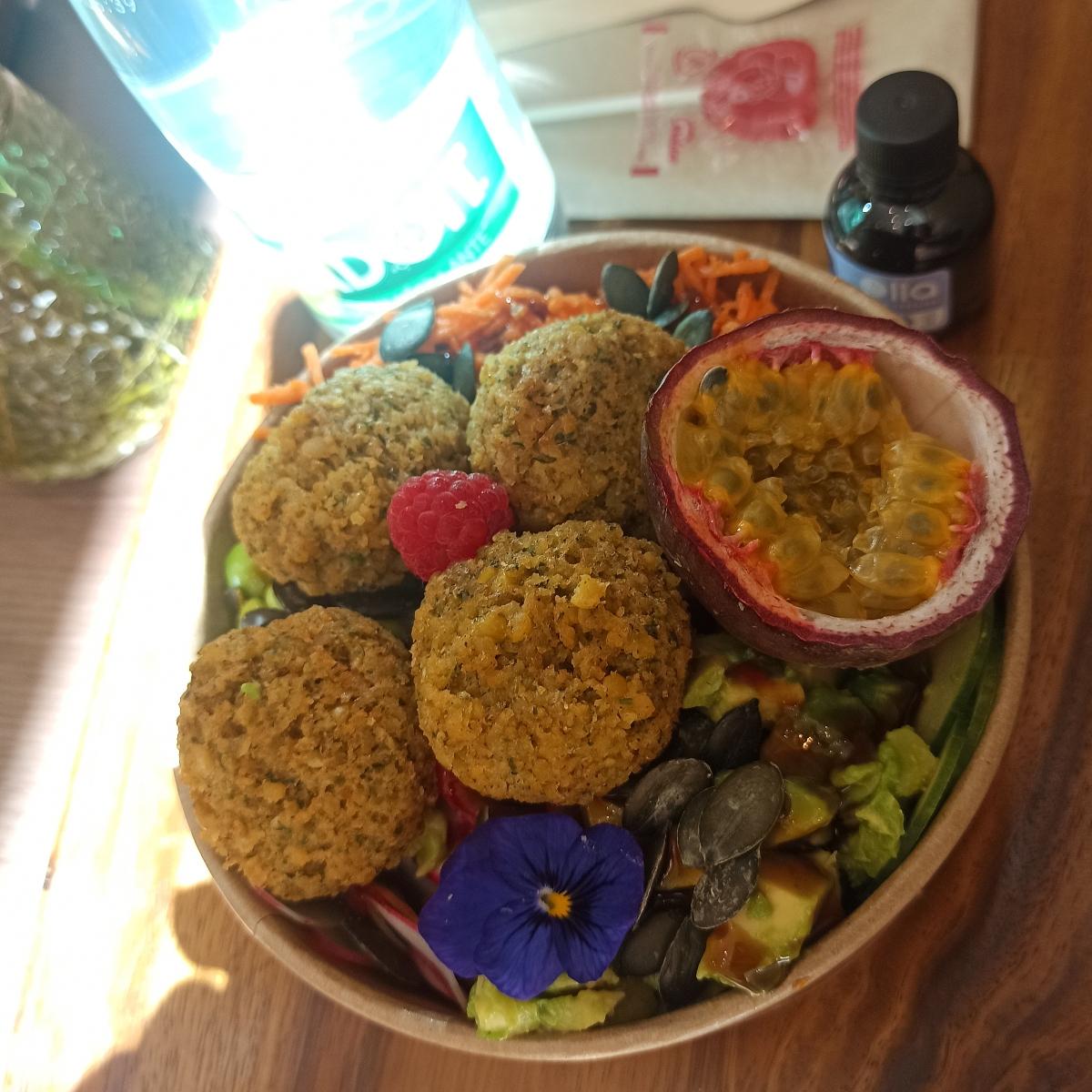 Le petit plus c'est le fruit (fruit de la passion pour moi). Sinon on retrouve des falafels, carrotes bio (bravo le bio !) , edamame (toujours un plaisir), un petit riz et d'autres légumes doux.