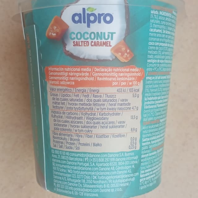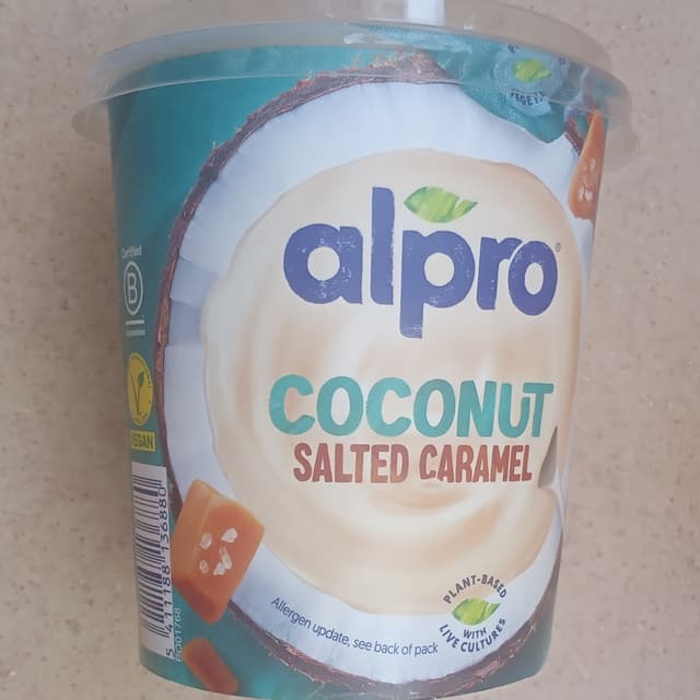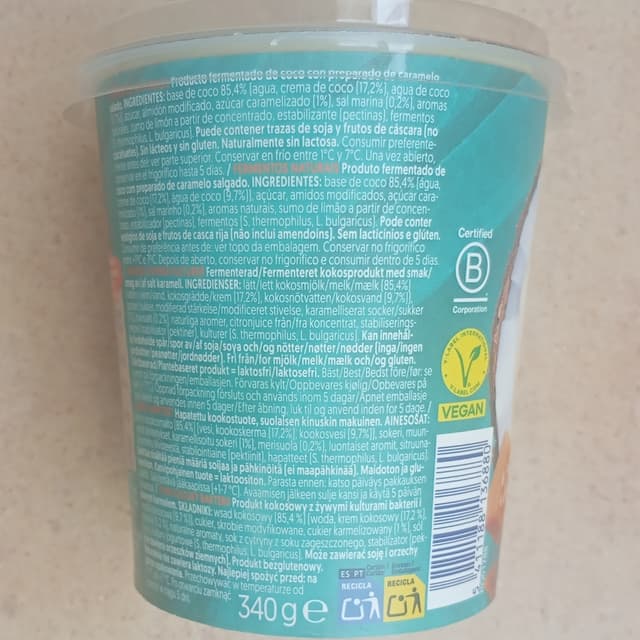 Yogur de soja, sabor caramelo salado. Un yogur muy sabroso, es un tarro grande pero se come del tirón. Estaban de oferta en Alcampo estos días y compramos 6. ¡Y sin fluidos mamarios de rumiantes!