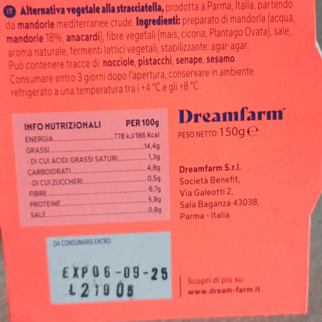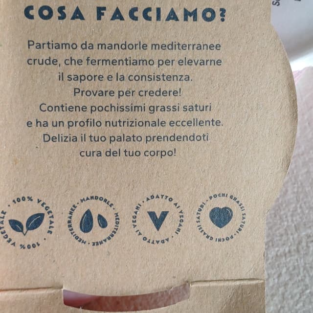 Stracciatella a base di mandorle mediterranee , bella texture morbida e omogenea. Gusto delicato. Mi piace , la uso sulle piadine , bruschette, panini ecc