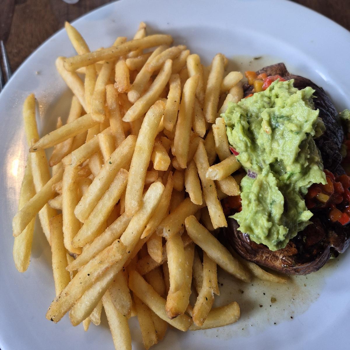 Me armaron ests plato con zucchini, portobello, guacamole y papas, muy muy rico