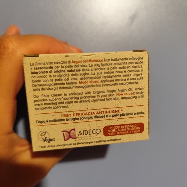 Crema viso antirughe all'olio di argan valida e facilmente reperibile nei supermercati, con un buon rapporto qualità prezzo. Nuova confezione in vetro.