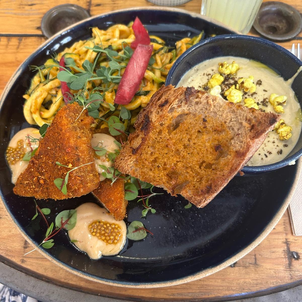 The dish was a delight to the eye and tasted just as good. A soup made from creamy corn topped with curry flavoured pop corn which gave it a nice zing. It was served with oiled toasted bread. Also extra crispy tofu with chipotle mayo, pickled mustard seeds and raw courgette spaghetti and spiced yogurt sauce. This restaurant is fully vegan and sources 95% of the fruits and veggies and 80% of products from France and the balance is fairtrade. Also only organically grown produce. Friendly staff and a relaxed atmosphere. Definitely worth a visit so good.😊
