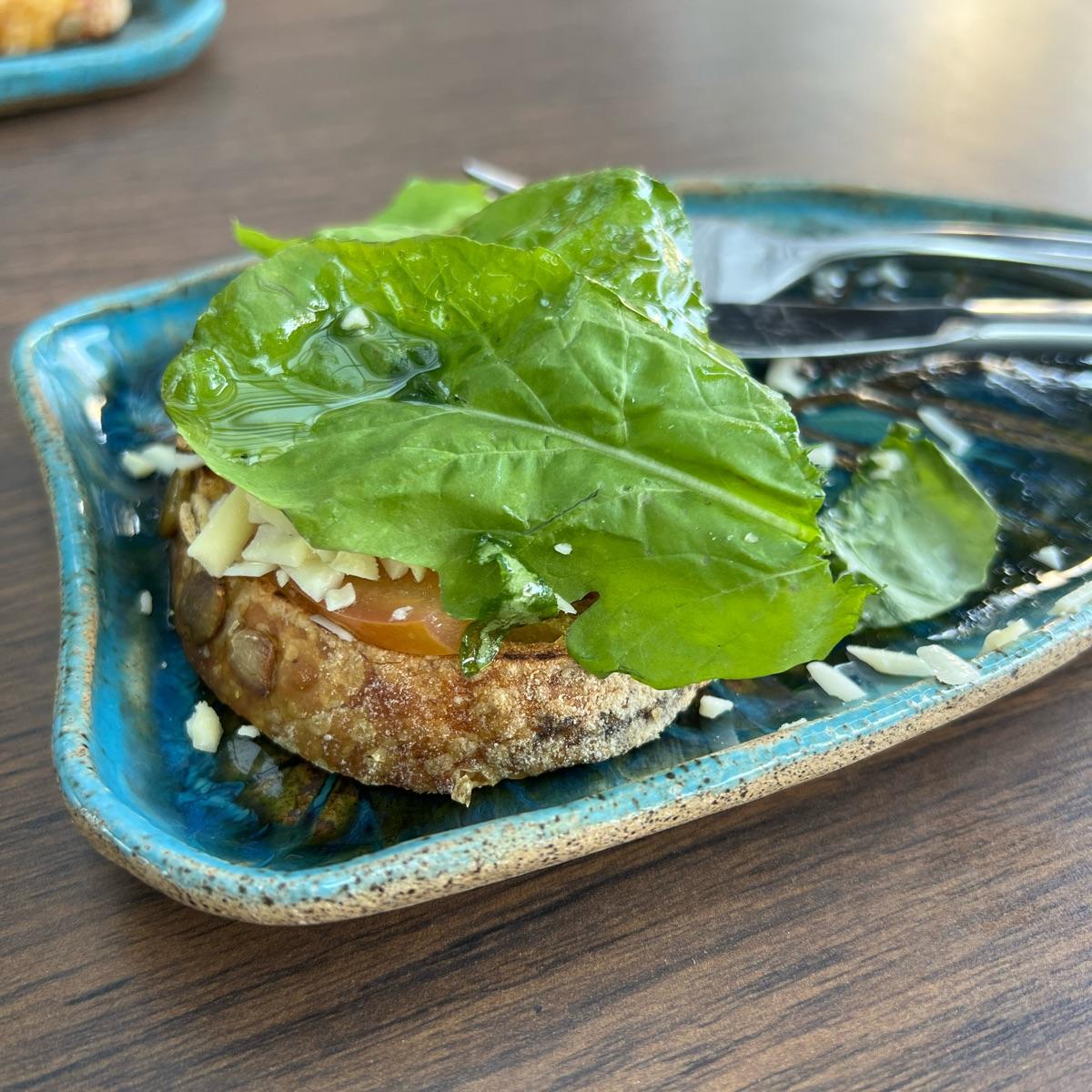 Pão com queijo de castanha, tomate e manjericão. Refrescante.