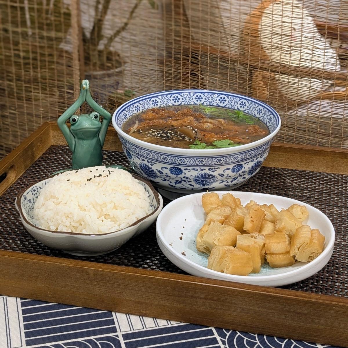 Hearty herbal 'bak kut teh' soup that was quite deep in flavour, my companion kept slurping up the broth up hahaha. 🍲 Came brimming with lion's mane mushrooms, shiitake mushrooms, enoki mushrooms, radish, taupok fried beancurd puffs, and soy knots; plenty of ingredients to accompany the white rice. 🍄‍🟫🍚 Served with youtiao fried dough fritters, though I did find it rather greasy and soggy hence knocking a point off; personally would have preferred it to be more crunchy! ($14, allium-free) #sgvegan #alliumfree