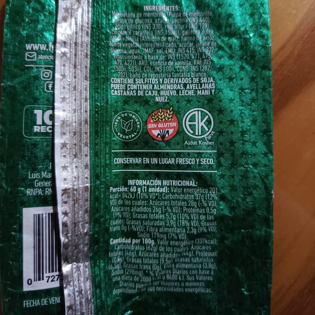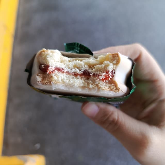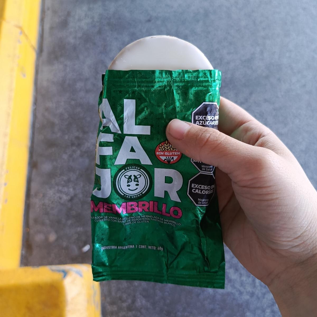 Alfajor de vainilla relleno de mermelada de membrillo cubierto con baño de repostería fantasía blanco.