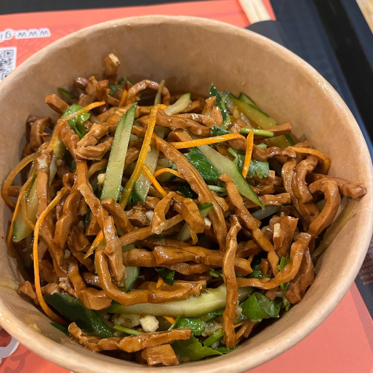 Il piatto è veramente buonissimo, Tofu super firm freddo con cetrioli e coriandolo, abbastanza piccante. Il sapore è spaziale, ma forse un po’ troppo agliato. Servito freddo.