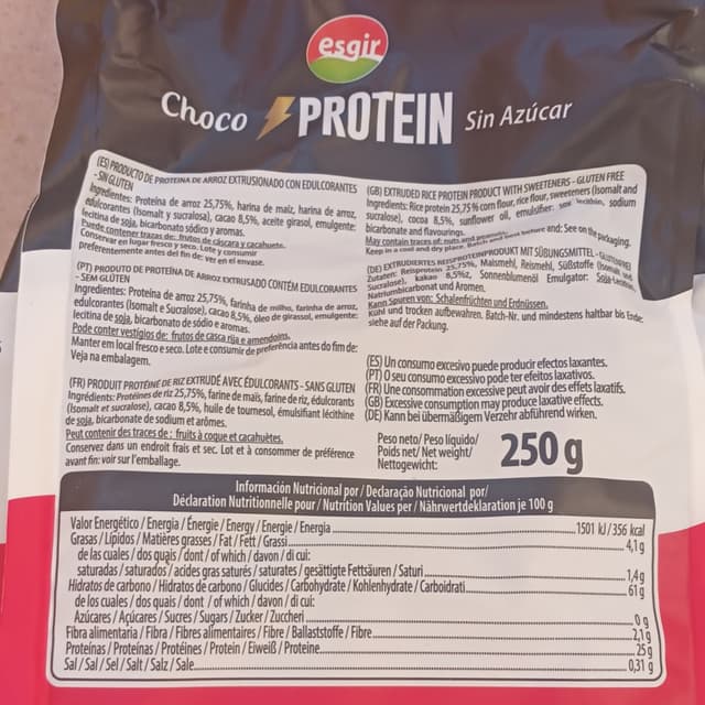 Cereales para desayunos y meriendas a base de proteína de arroz y con chocolate. Son azúcar, con edulcorantes. Crujientes y bien de sabor. Altísimos en proteínas, 25g por cada 100 de producto.