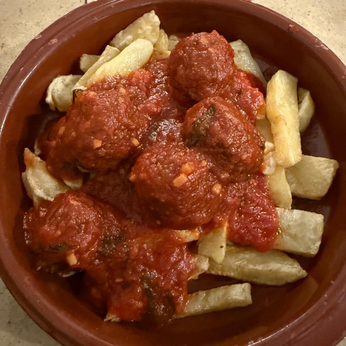 These were a pleasant tasty surprise! The sauce was amazing and the meatballs were dense and flavourful. It was interesting they came on fries but it tasted good! #veganmeatballs #tomatosauce #papasfritas #jenandryesagavemoon