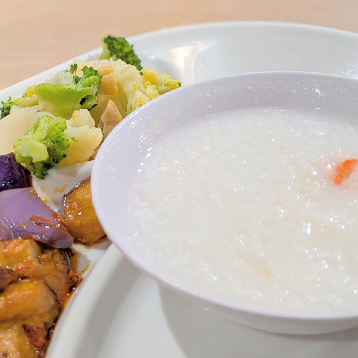 Ah. Love the simplicity of white congee - nearly plain with the light, minimal addition of carrot chunks. Nourishing stuff! Had this at this morning's choose-your-dish breakfast selection alongside the always superb wok hei-filled eggplant stirfry and the less impressive broccoli cauliflower dish.