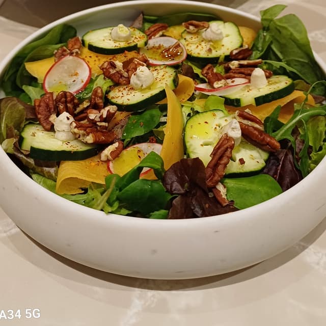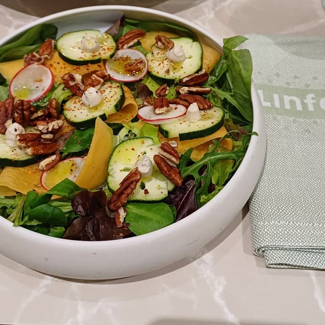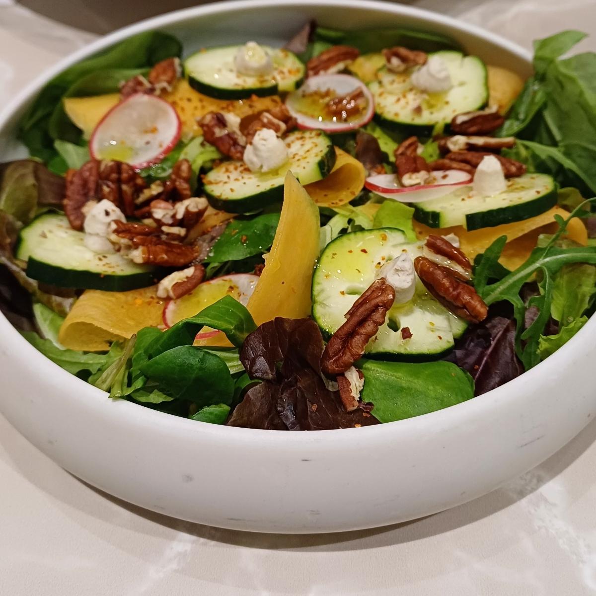Una bella insalata mista con tante cose buone. Base misticanza, sottilissime fettine di melone, cetriolo, ravanello e noci pecan (❤️). Sono rimasta un pó delusa dal "roquefort" che c'é ma sotto forma di dadini minuscoli. Del condimento tajin ho percepito solo il lime.