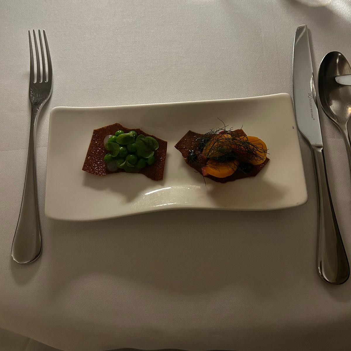 These vegan canapés were absolutely incredible. One was walnut puree with heritage beetroot and pearls of balsamic and the other was peas with a lemon compote/puree, both on a potato cracker. These were absolutely delicious and so innovative 🌱