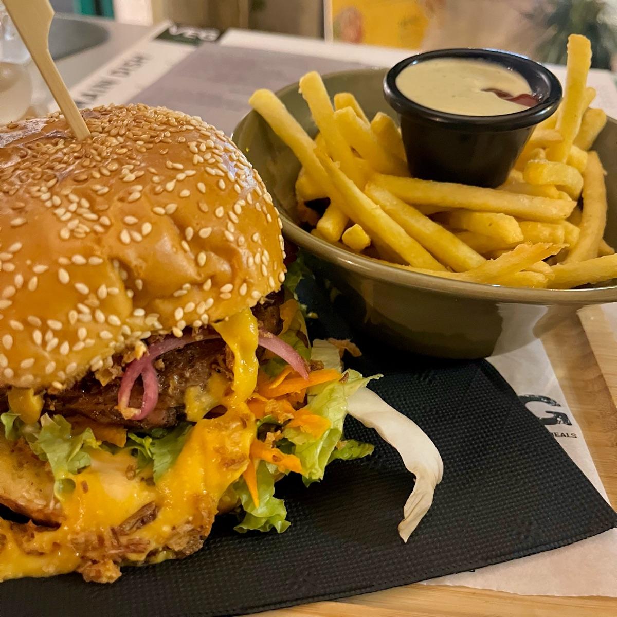 A decent burger with a bean patty and salad with cheesy sauce filling. Taste 4.5/5 😋