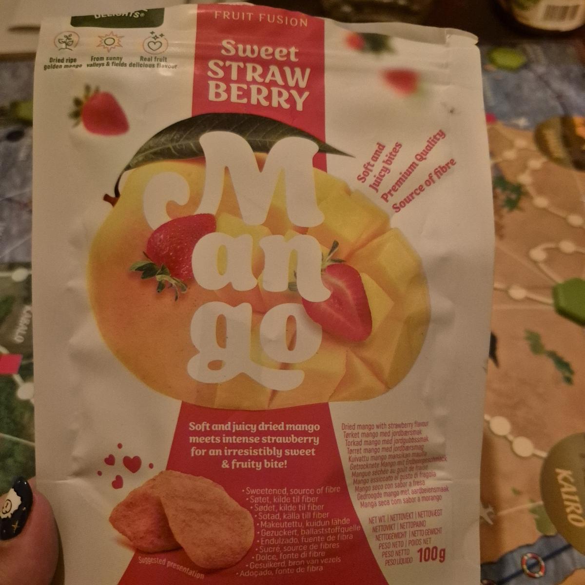 Dried mango with sweet strawberry flavor. My mom loved it (and forced me to tell you that she loved it) and I hated it haha. You'll probably like it if you like dried fruit!