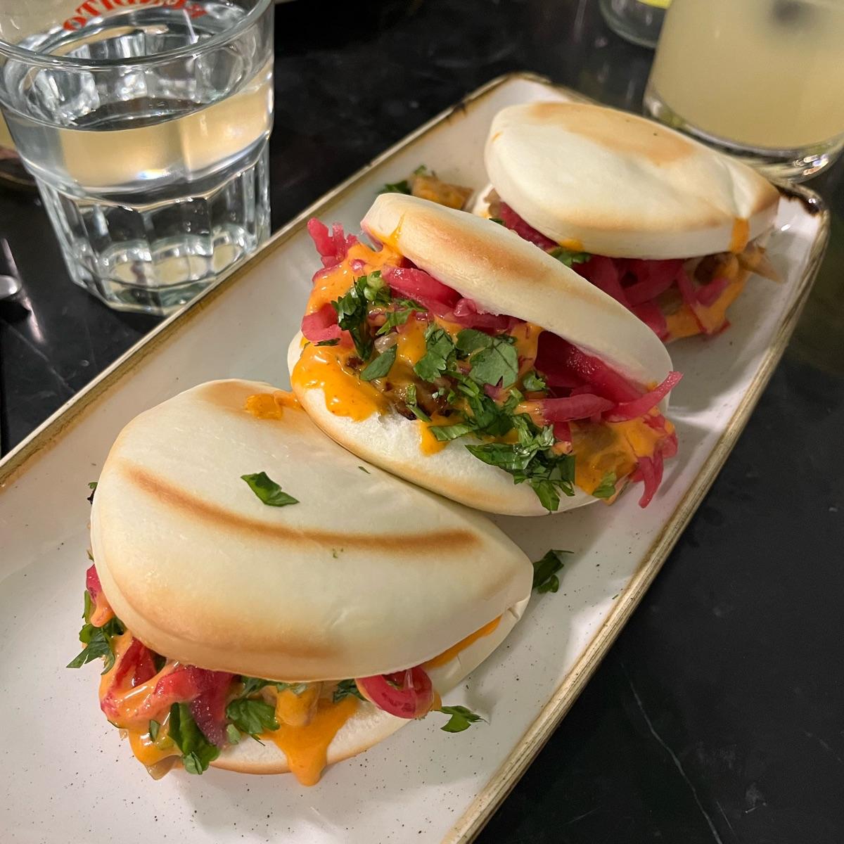 Riquísimos!! Rellenos de heura, cebolla encurtida y sriracha mayo. Pican pero no demasiado. El pan del bao estaba super blandito, me encantaron.