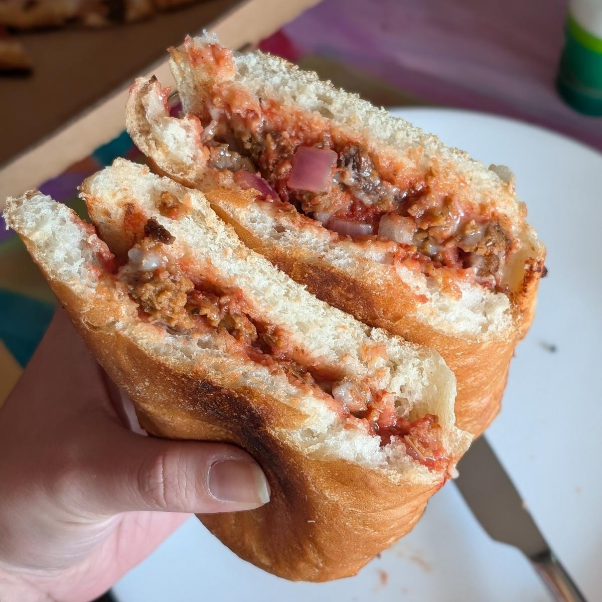 I love Parkway's pizza, but sometimes it's fun to mix it up. I liked trying out this sandwich, but I think I'll still choose the pizza for delivery. This sandwich has vegan sausage, marinara, onion, and vegan mozzarella. It's a bit dry, but it might be better in the store. It still wasn't bad. I liked the vegan meat, I just think it's better as a pizza form.