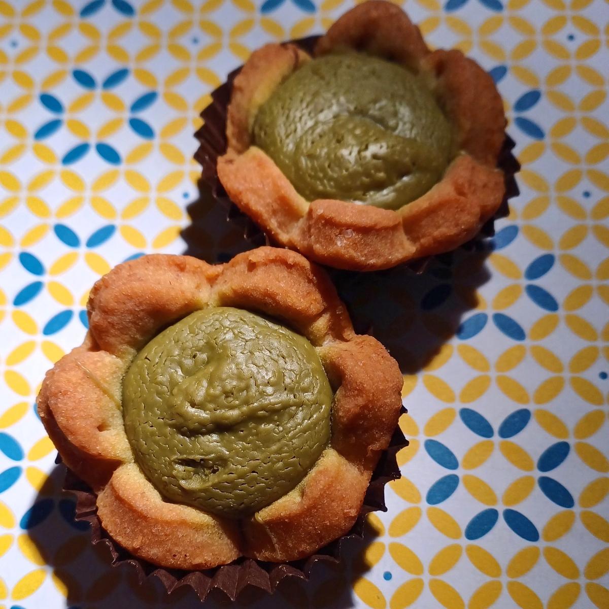 Deliziose crostatine, ma la farcitura al pistacchio é un pó troppo dolce. La pasta frolla é fatta con anche farina integrale e di ceci. Senza zucchero bianco.