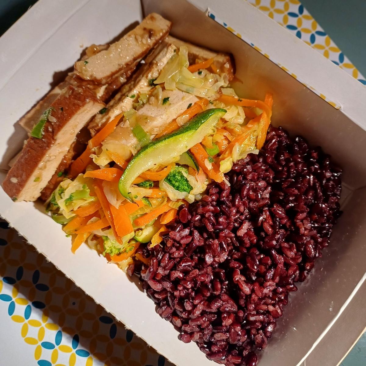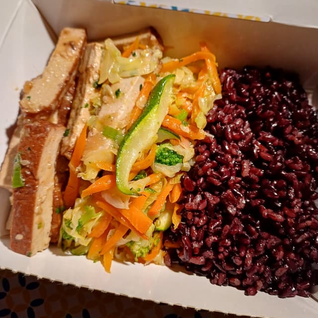 Piatto cosiddetto "equilibrato", in questo caso anche #senzaglutine. É composto da striscioline di tofu affumicato, non male nel suo genere. Verdurine condite con olio piccantino e il riso venere più tenero e buono che mi sia mai capitato. Di solito infatti dal riso venere mi tengo a distanza 😃.