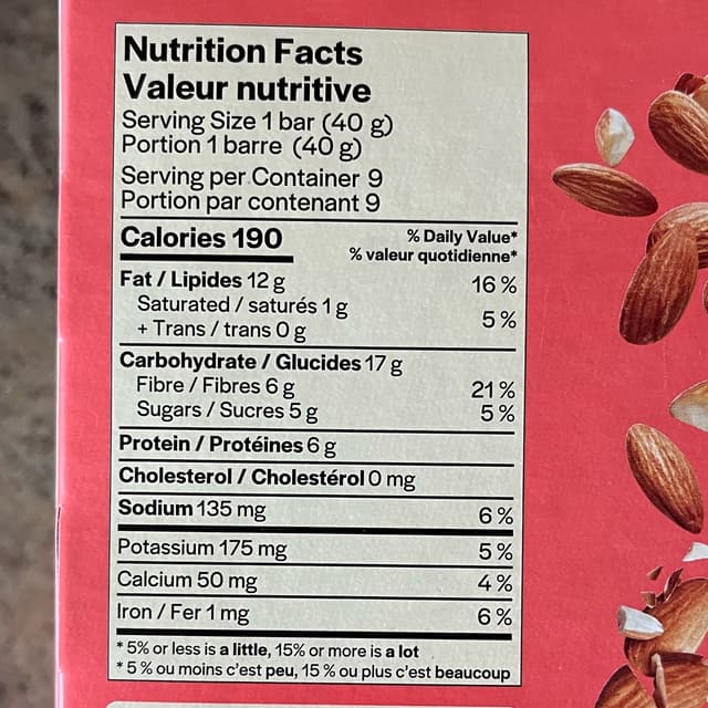 I absolutely love the taste of these bars. The raspberry-lemon combination is wonderfully paired. Many of the ingredients are organic. The nutritional profile isn’t too bad with each bar providing more than 1/5 of your day’s required fibre, a few other nutrients and there’s not much sugar either. Admittedly, the fat content is a bit high.