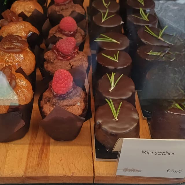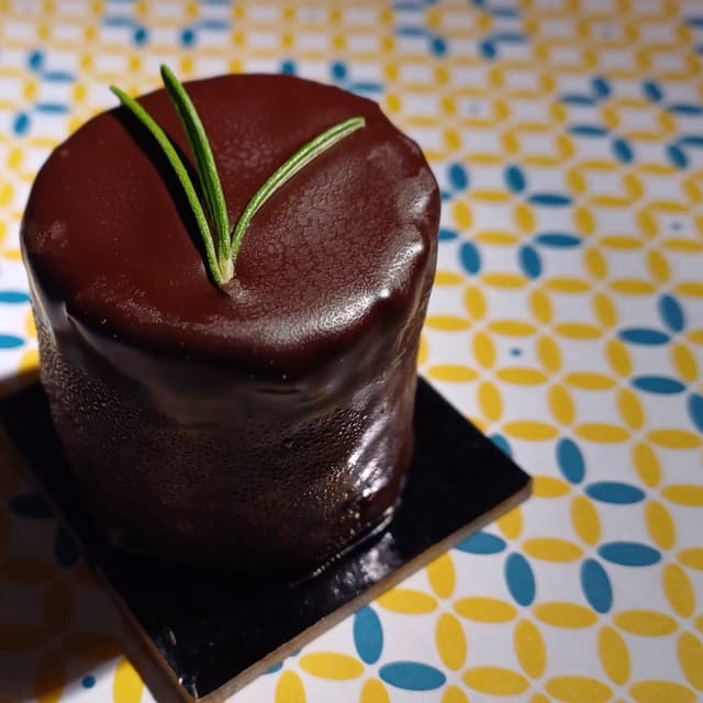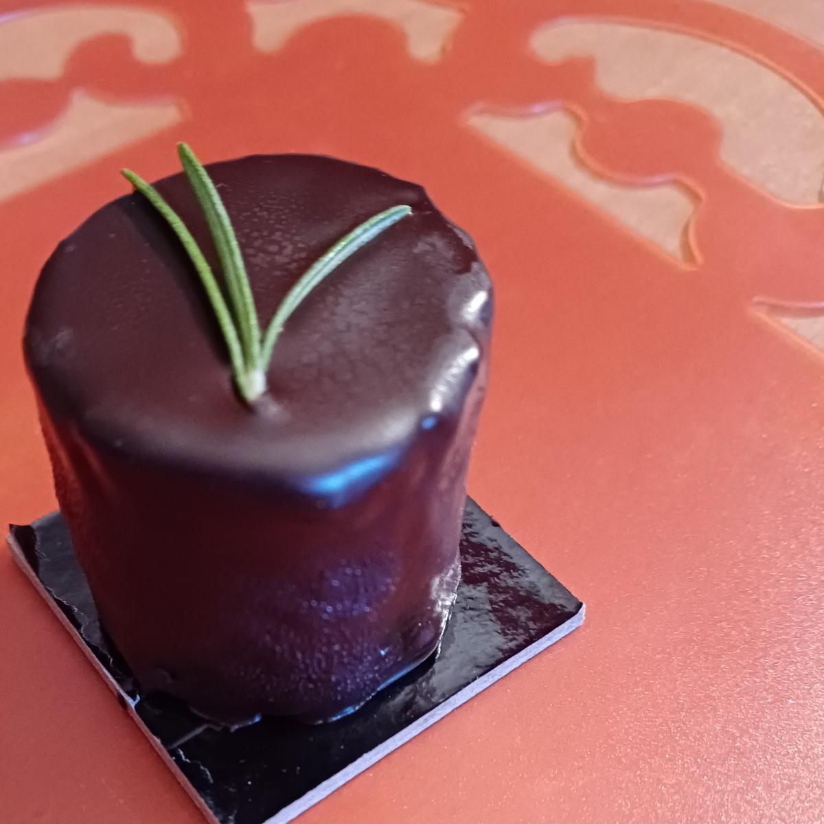 Ma quanto é carina questa mini sacher vegana decorata con mini rametto di rosmarino 💕!!? Morbida, onestamente cioccolatosa, con la particolarità della marmellata di ribes. É una mini porzione ma dà soddisfazione.