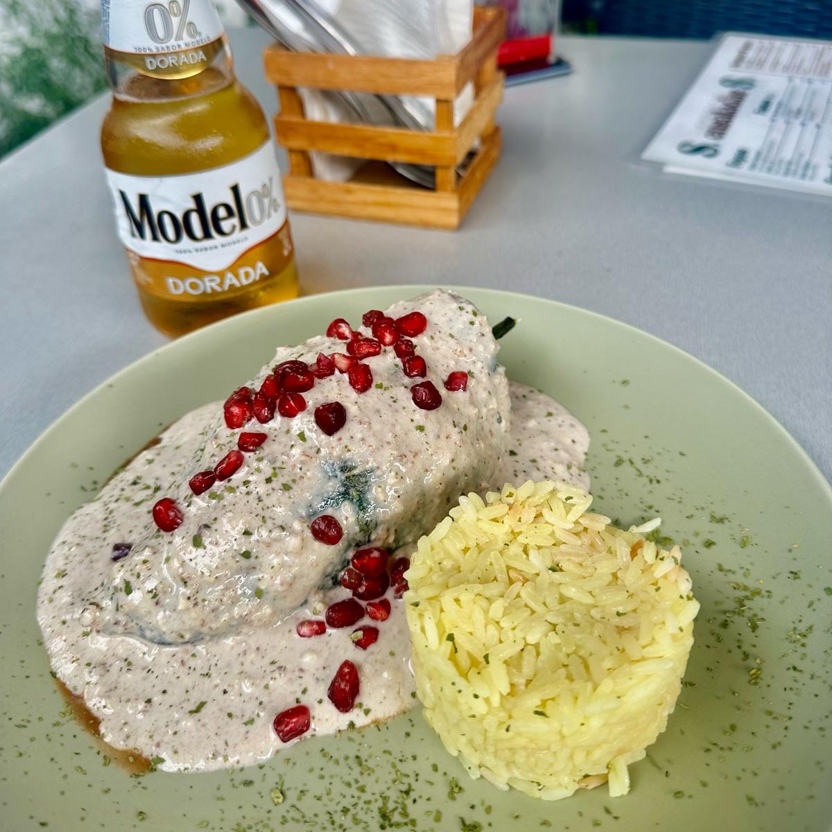 Para terminar con la ruta del chile en nogada, fui a este lugar que vi que tenía muy buenos comentarios. El chile super rico, estaba relleno de un guisado de lentejas con frutas y estaba buenísimo, no estaba nada dulce en comparación con el resto y la porción de arroz muy atinada. La chica que nos atendió súper carismática y atenta, excelente atención 👍🤩