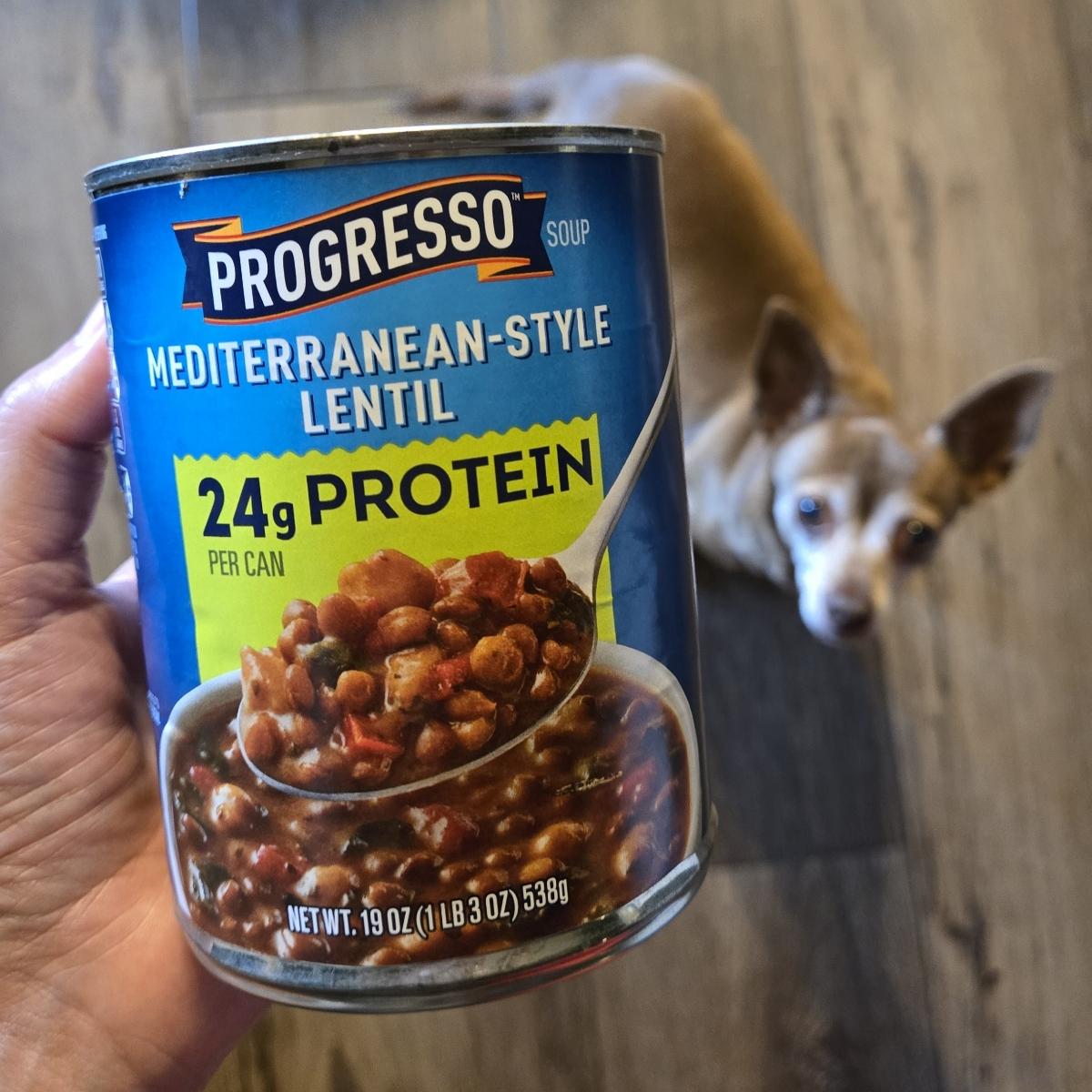 Progresso Mediterranean-Style Lentil Protein Soup is remarkably delicious, cozy, and savory. It consists of lentils, chickpeas, spinach, and roasted red bell peppers in a tomato based broth. Packed with lots of plant-based protein. It is a spoonful of comfort. 🥰