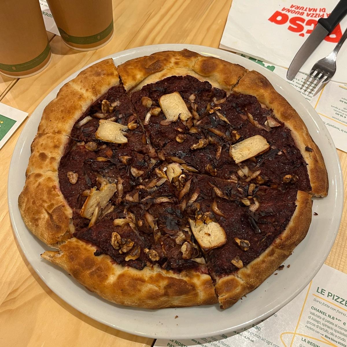 Pizza molto particolare con crema di radicchio cipolle caramellate e formaggio veg. È dolce ma anche amara per il radicchio. Ho sentimenti contrastanti a riguardo 🤣