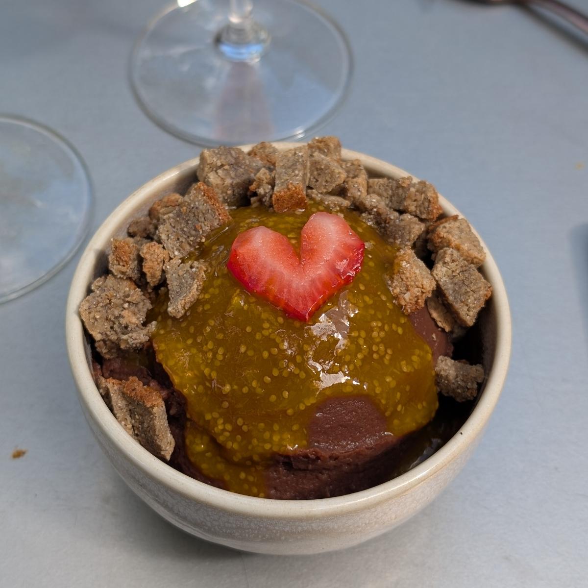 This chocolate pudding made with sweet potato is topped with golden berry jam and corn cookie crisp. After two small savory dishes, a sweet dish was calling to us before hopping back on our bikes. This was dense! It's not a light pudding and it's not too sweet. It was fun to try, but I'm not sure I would get it again. It was kind of a chore to get through my portion. I really love that they played it so night with the strawberry heart. ❤️