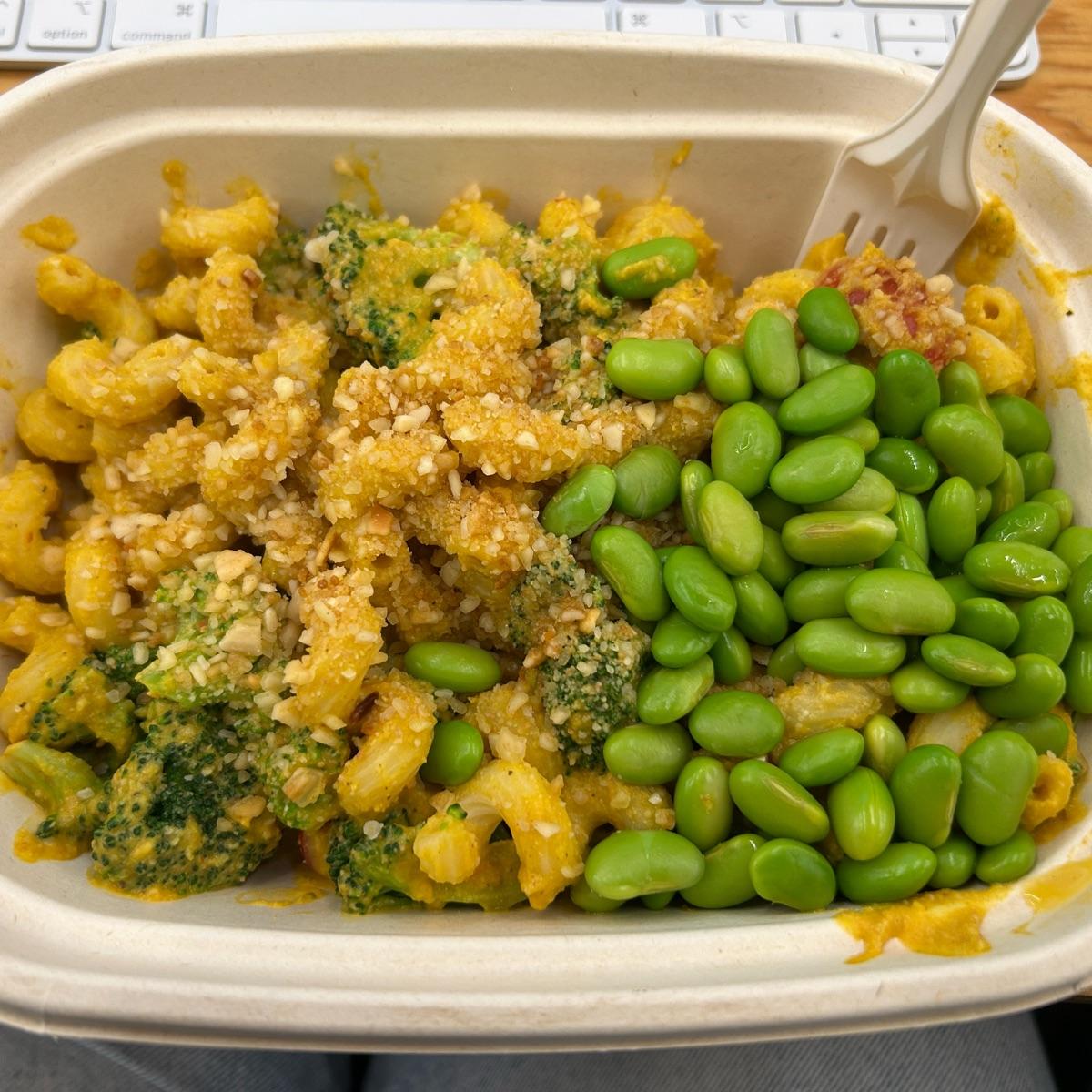 Delicious and creamy vegan mac n cheese with a side of edamame for the extra protein. This also has cherry tomatoes and kale.