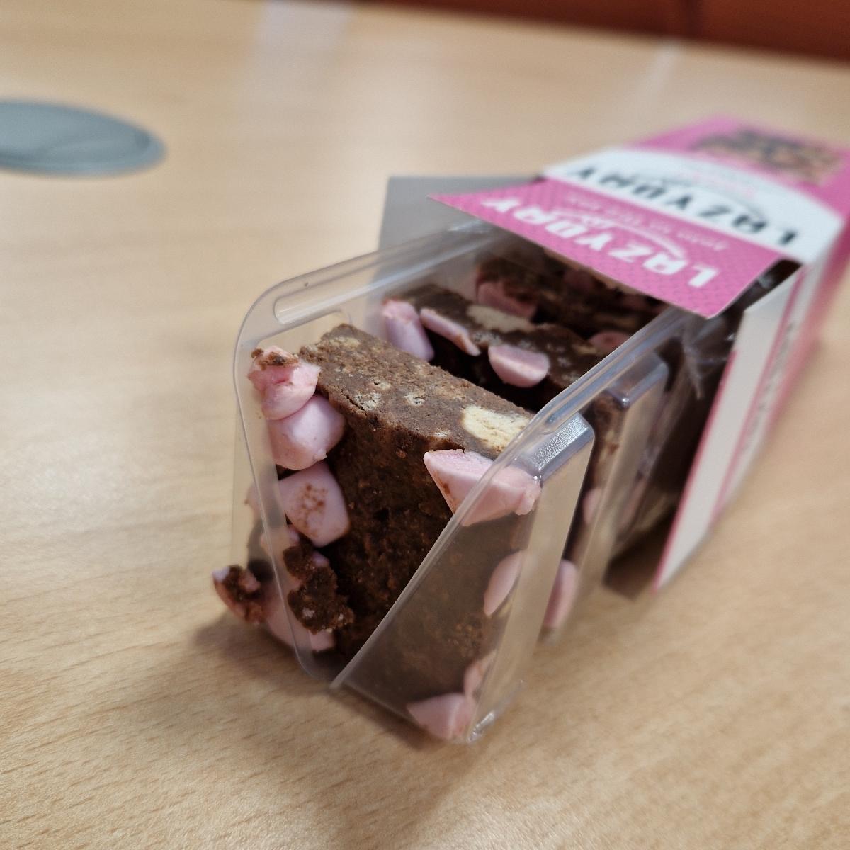 I got these rocky roads as a little treat a few times. They have an uneven texture which I really enjoy, and they're very sweet. They mostly taste of sugar, but the strawberry marshmallows and chocolate provide some flavour.