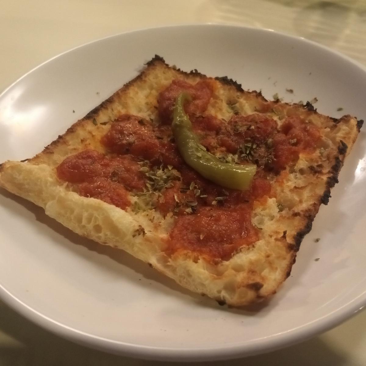Pan tostado con sobrasada vegetal y guindilla. Crujiente y sabroso. 3"5€. Entrante de la carta vegana que dispone esta pizzería. Amplia variedad para que no haya excusas a la hora de elegir comida elaborada sin muerte de animales.