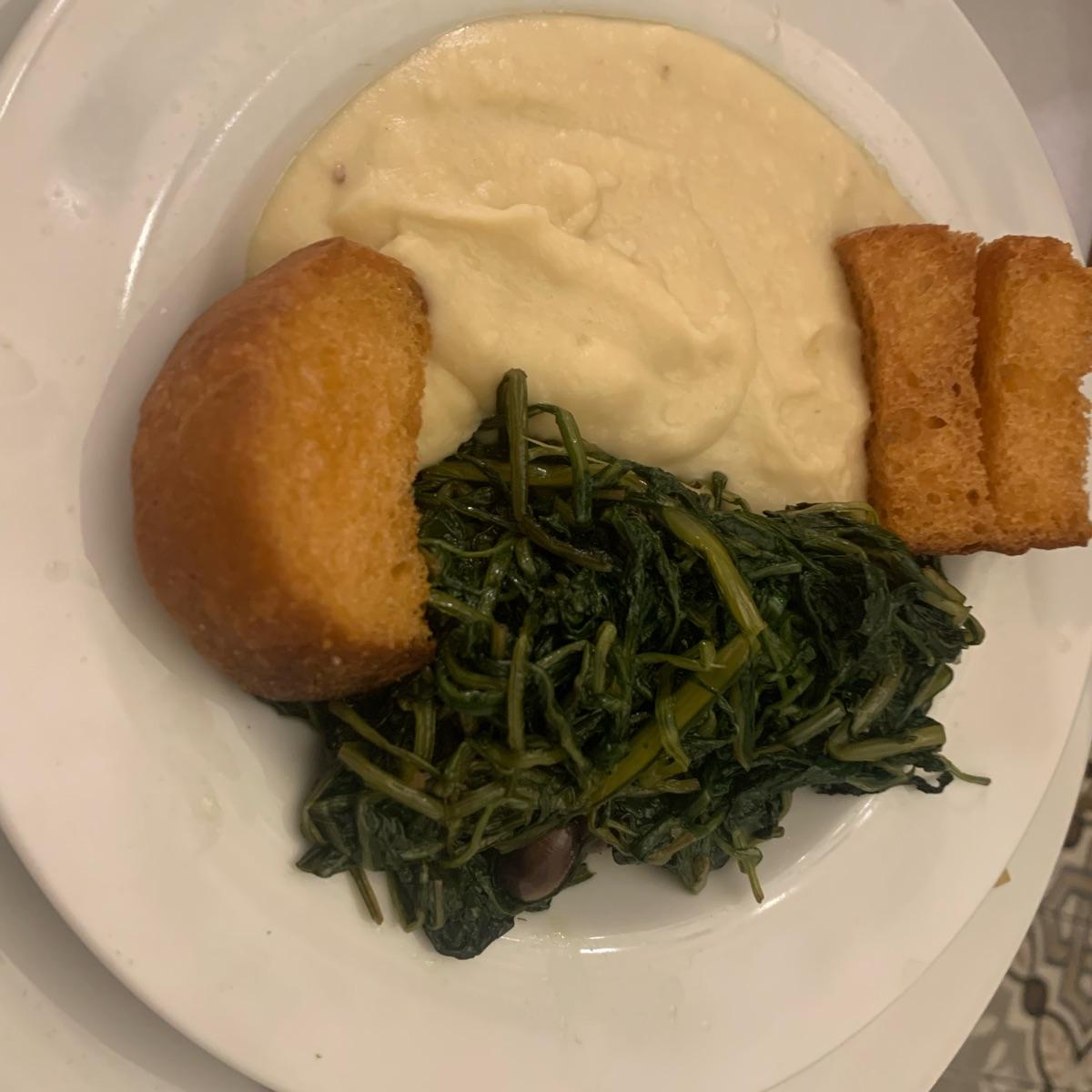 Altro classico della tradizione salentina. Purea di fave con cicorie, a scelta anche ripassate con aglio, olio peperoncino e olive taggiasche e crostini di pane croccanti. Il mio piatto preferito! Abbondante