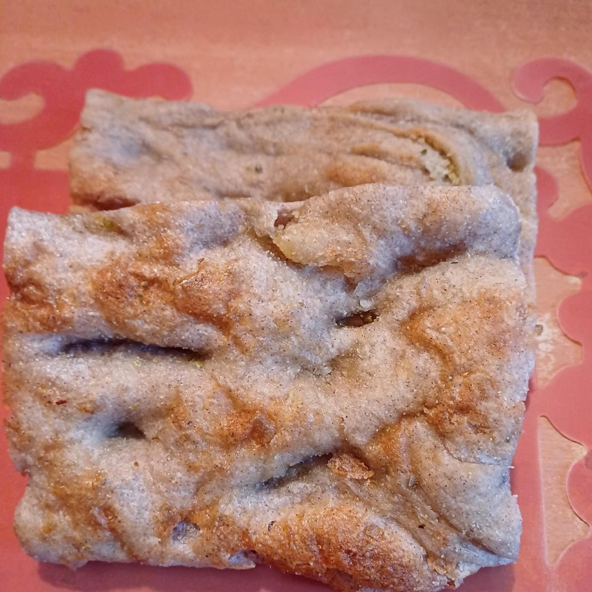 La proprietà di Rosebymary é della famiglia Marinoni nome noto della panificazione milanese. Questa focaccia rustica però non mi é particolarmente piaciuta. É fatta con anche farina di riso che so che in cottura diventa scura (soprattutto la farina di riso integrale) e questo ne spiega il colore. Si sente il rismarino. Un pó troppo secca.