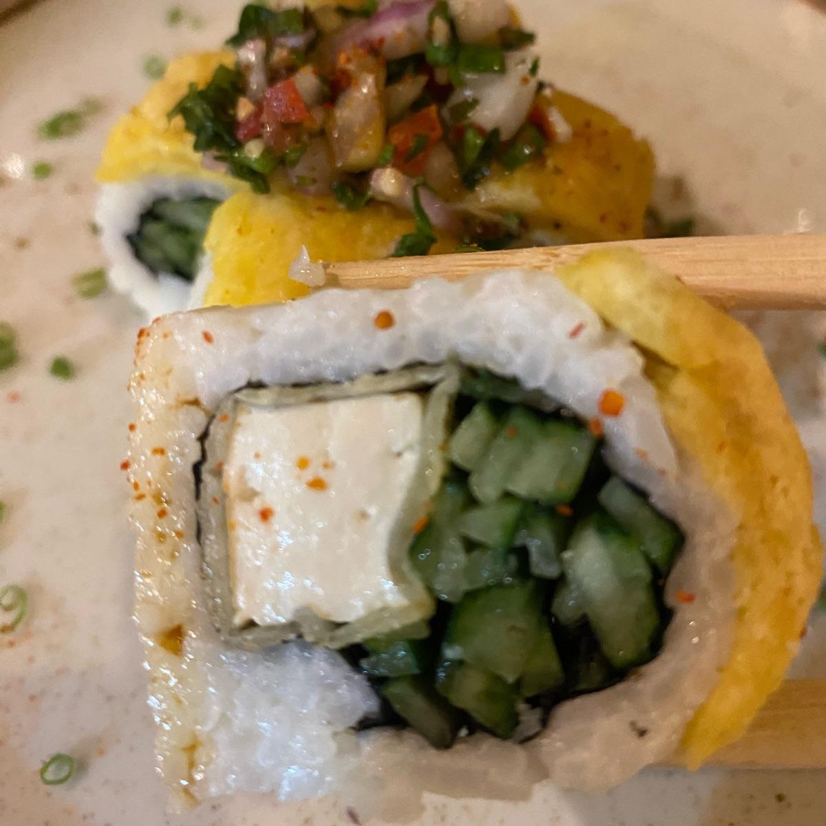 #elchinovegano hizo un festival amazónico y me pedí estos makis que tenían una lamina de plátano frito encima y el relleno era tofu y una verdura que no identifico. Muy rico.