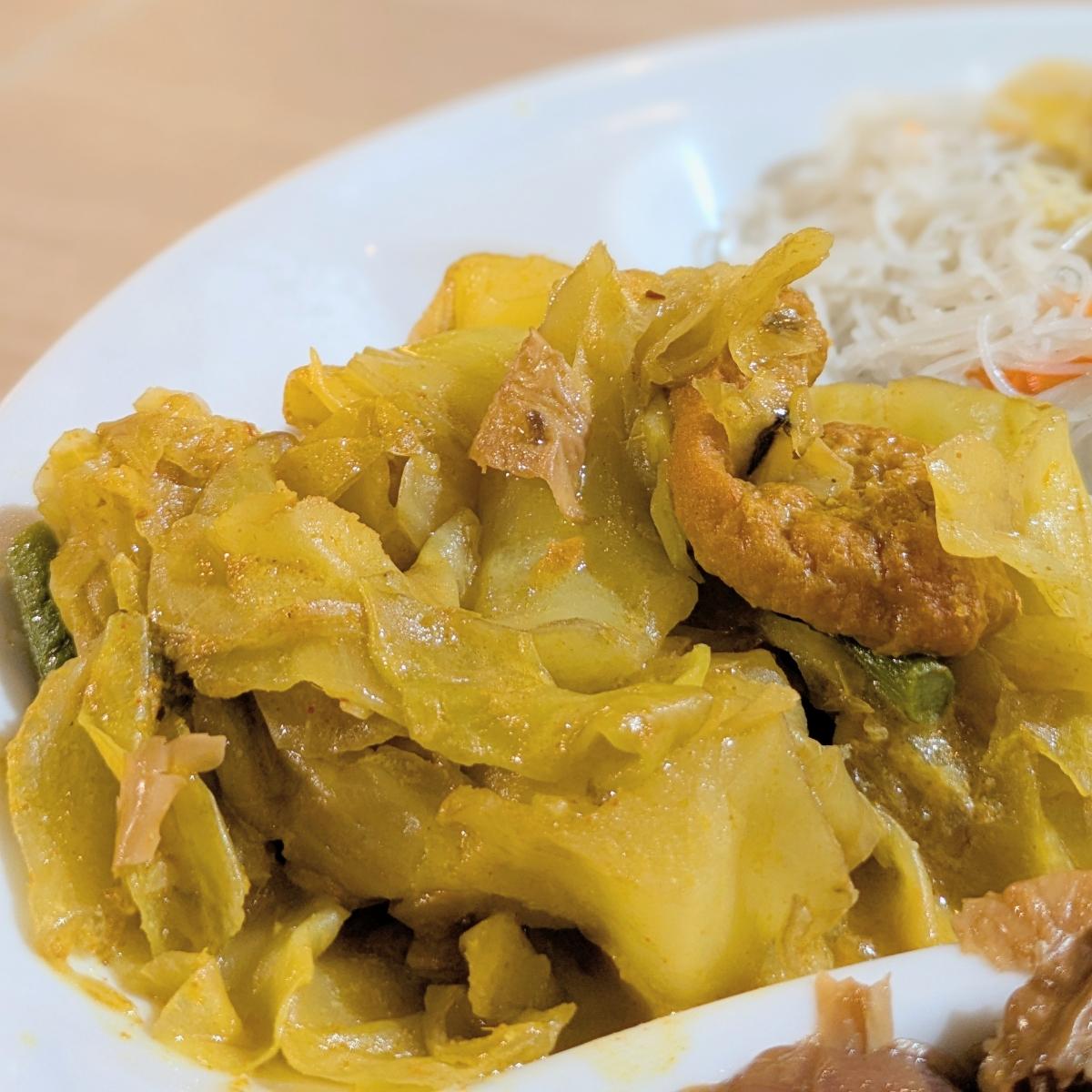 White cabbage leaves, long beans and taupok simmered in a super light curry base. Would have preferred a more 'lemak' coconut milk base rather than this watery rendition, butt it was still good.
