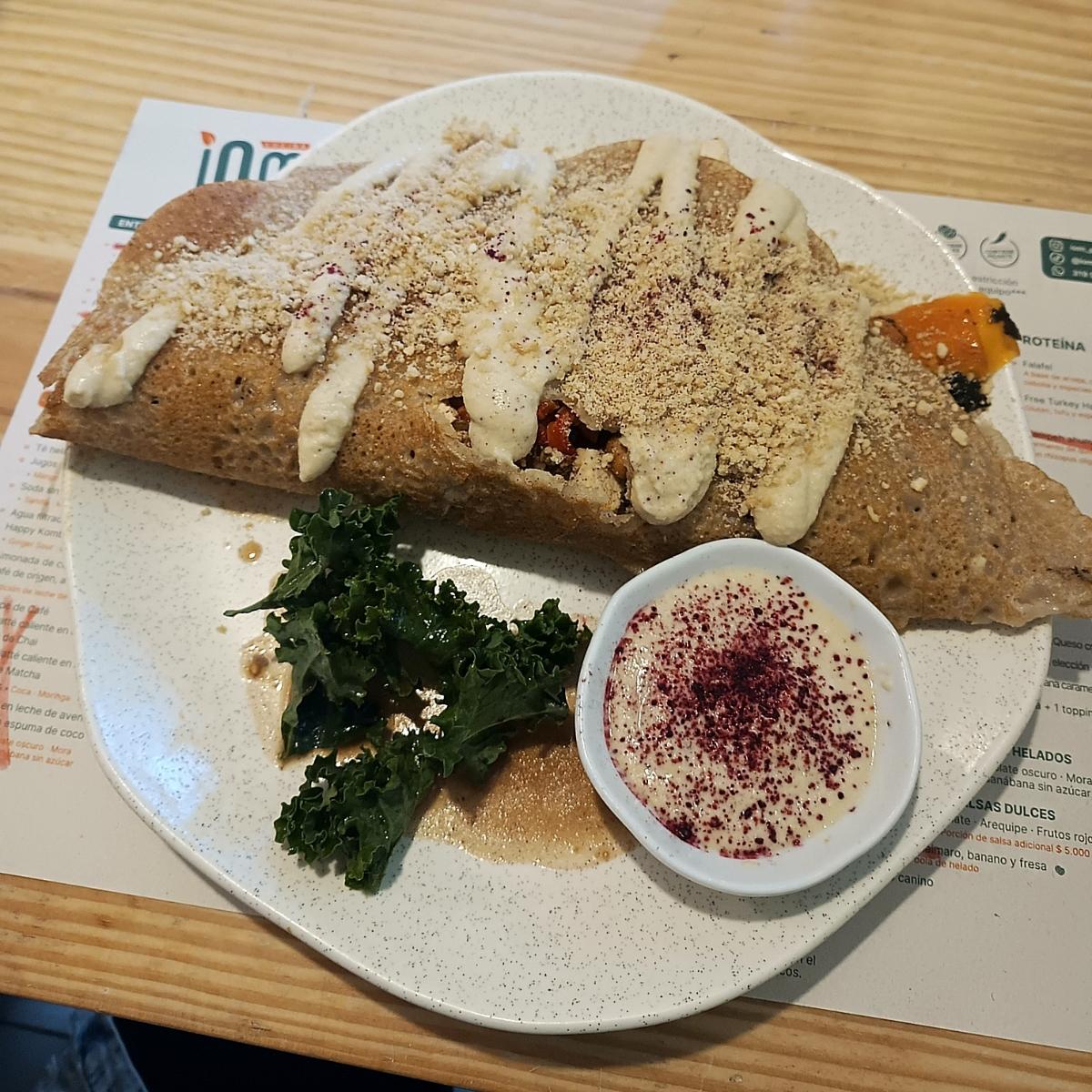 Siguiendo los 5 pasos sencillos para armar tu plato, así quedó este crepe: la masa es de quinoa y maíz, el relleno de garbanzos crocantes, zanahoria, tofu, tomates secos, chorizo de tofu y hummus. Era enorme! 😯😋