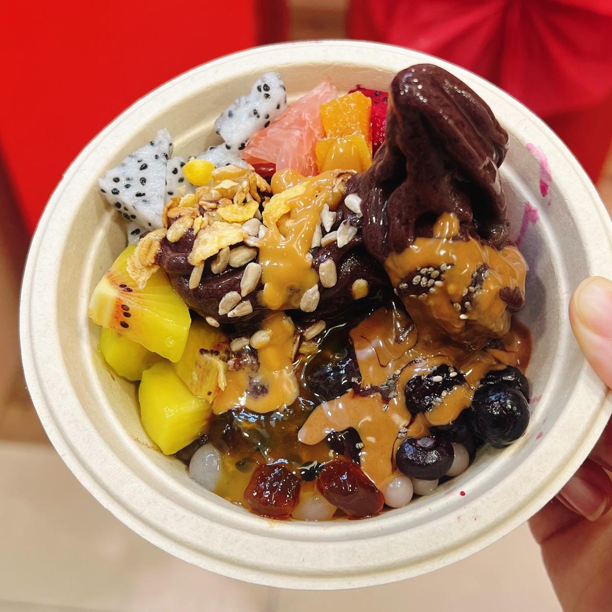 Appreciate the wide variety of toppings, incl mini taro pearls, fruit and coconut jellies, popping fruit syrup balls, fresh premium fruits (kiwi, dragonfruit, grapefruit & blueberries), dried fruits (kiwi, mango etc), biscoff sauce, almond butter, chia seeds, granola, pumpkin seeds and more!