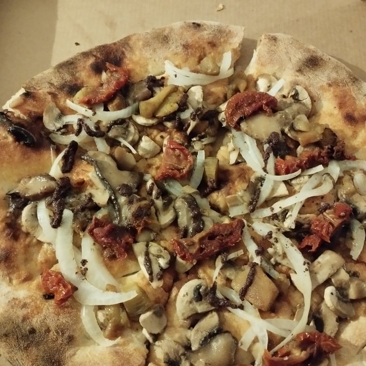 La masa gordita como me gusta. Los ingredientes: tomate seco, cebolla, setas.