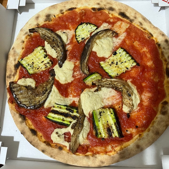 La pizza non è presente sul menù. Ho telefonato chiedendo suggerimenti per una pizza vegana e mi è stata proposta questa: pomodoro, zucchine e melanzane grigliate con crema di carciofi al posto della mozzarella. Davvero more