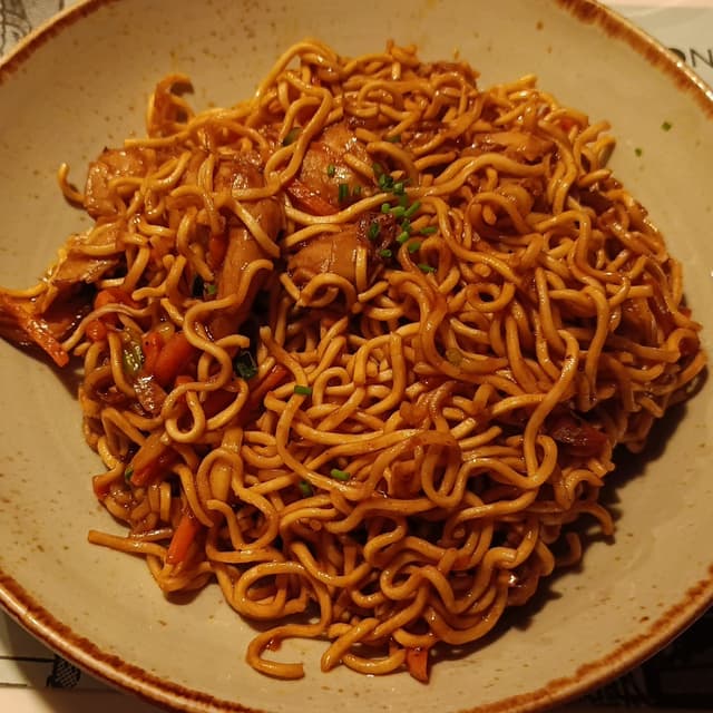 Una base de arroz, menos glutinoso de lo que me gustaría, con una salsa de cacahuete y verduras con tofu. El tofu... Era un acto de fé la verdad, pocos trozos y pequeños. La salsa estaba muy rica, pero poca cantidad, la mayoría del arroz te lo comes blanco. Y la cantidad... Bueno, ni fú ni fá.