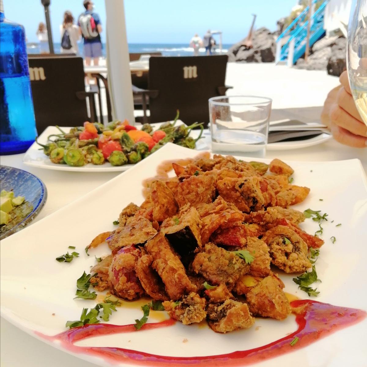 Finally decided to try this restaurant which has a handful of vegan options. This dish was unique as the veg chunks were coated with gofio, the corn meal typical to many traditional Canary Island dishes. Red, yellow and green peppers, red onion, eggplant, zucchini and mushrooms were coated with a delicate crunchy layer and drizzled with Canarian palm honey (plant-based from local palm tree sap). It was so delicious!!! Not the healthiest option being a fried food, but well worth trying. 7,50€ for a well-sized portion.