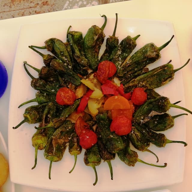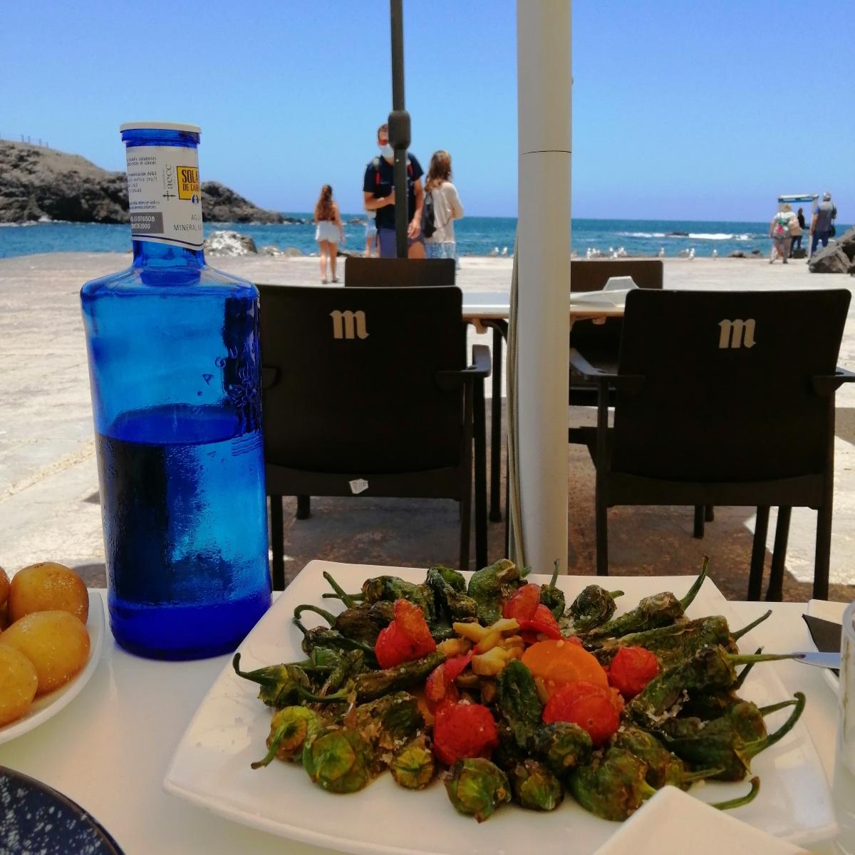 These bite-sized green peppers are deep fried and sprinkled with sea salt. A bonus was the roasted veggies that were in the center, along with several cherry tomatoes that were fried in with the peppers. 7,50€ as a side to split between two people. Eating next to the sea makes the experience one of a kind 😎 #foodwithaview #kimberleepower #refugiotheanimalacademy #pridemonth
